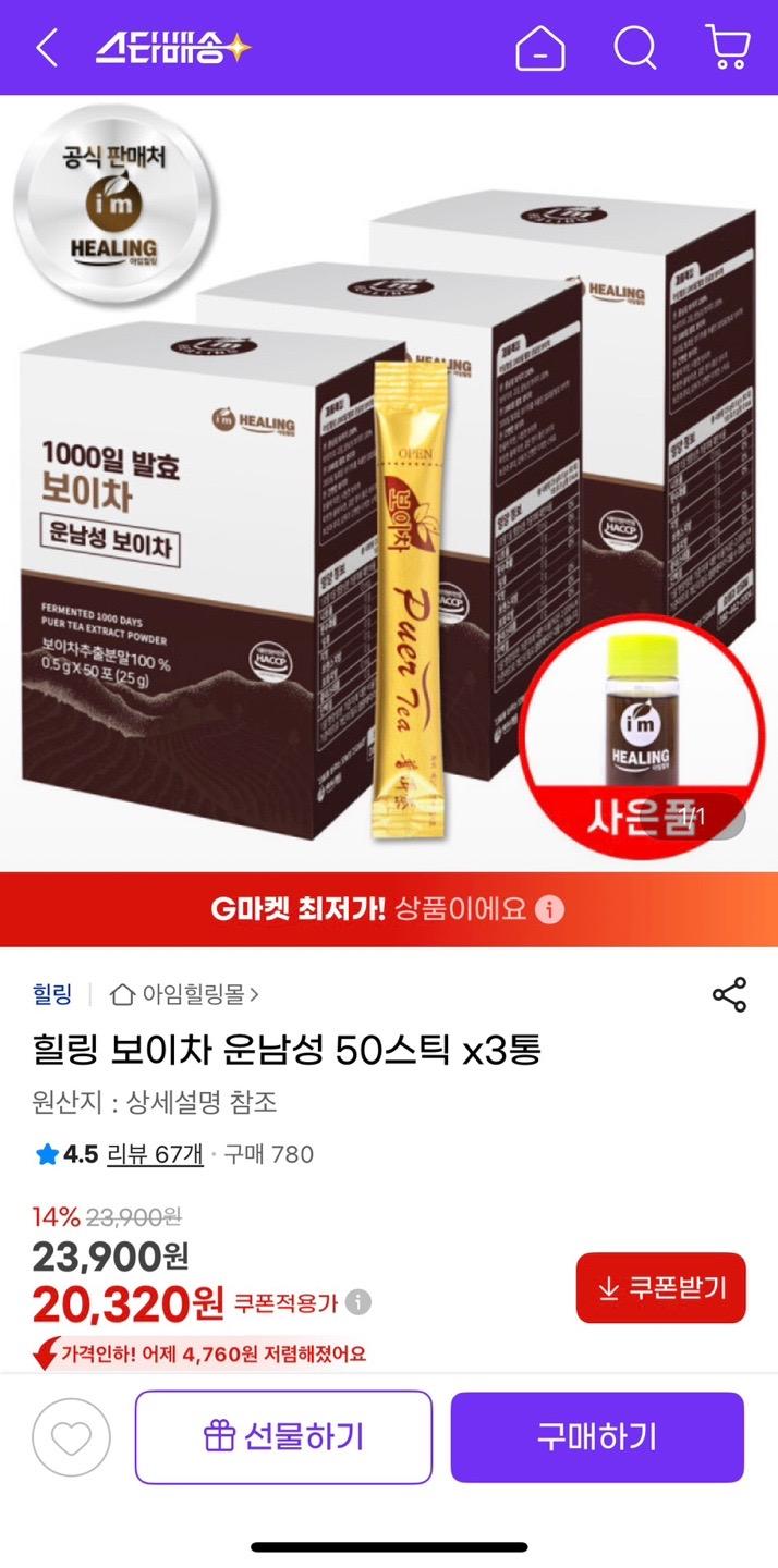[지마켓] 힐링 보이차 운남성 50스틱 3박스 + 사은품 (20,320원/무배) > 국내핫딜