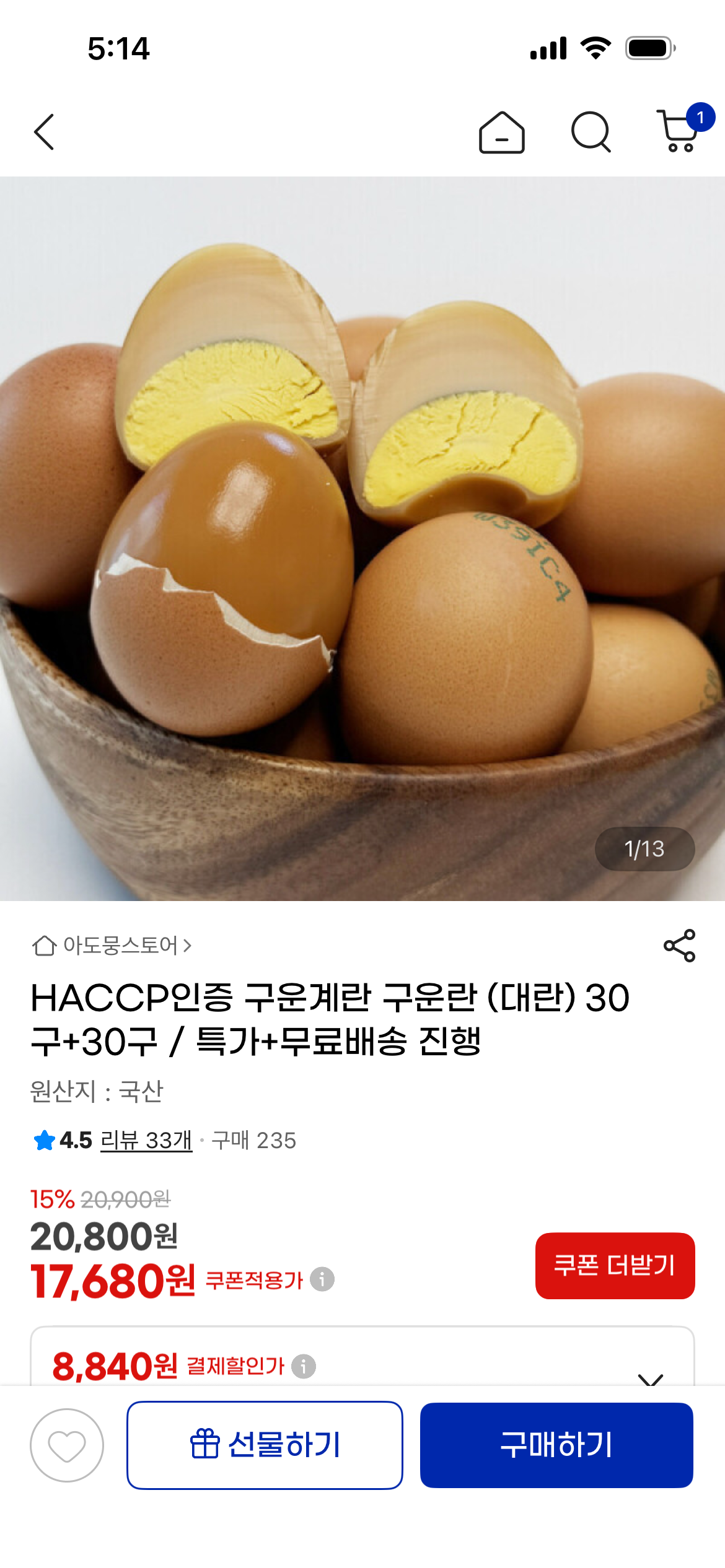 [지마켓] 구운계란 구운란 (대란) 30구+30구 (17.680원/무배) > 국내핫딜