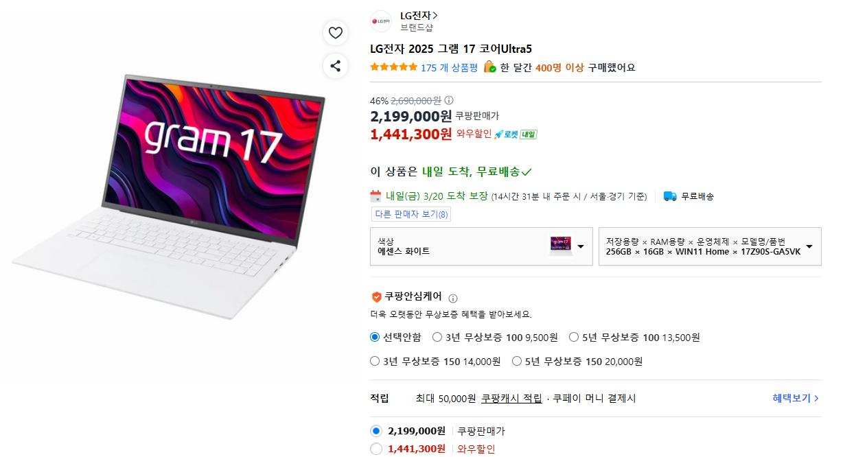 [쿠팡] 엘지 그램 17Z90S-GA5VK (1,441,300원/무료)