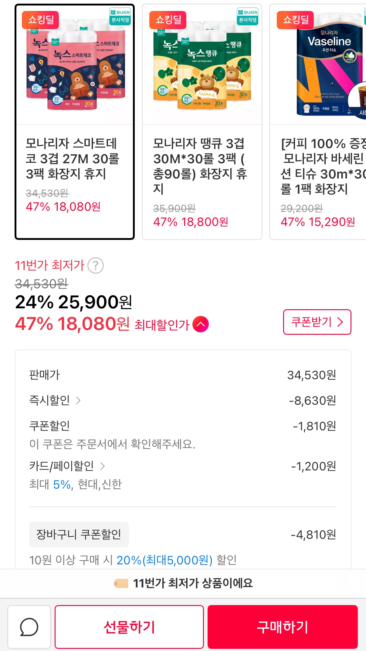 10시부터 선착순으로 받는 20% 밤짝쿠폰 적용하면 더 내려갑니다