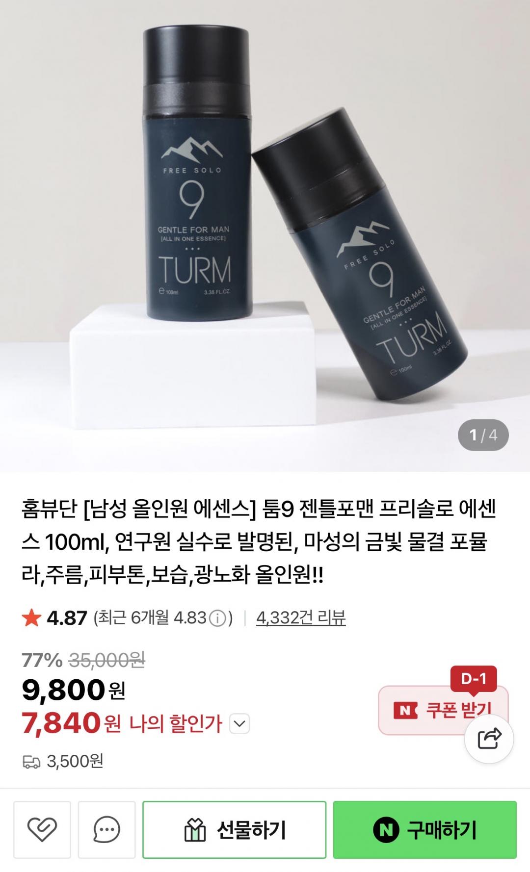 [네이버] 툼9 젠틀포맨 올인원 에센스 100ml (7,840원/네멤무배) > 국내핫딜