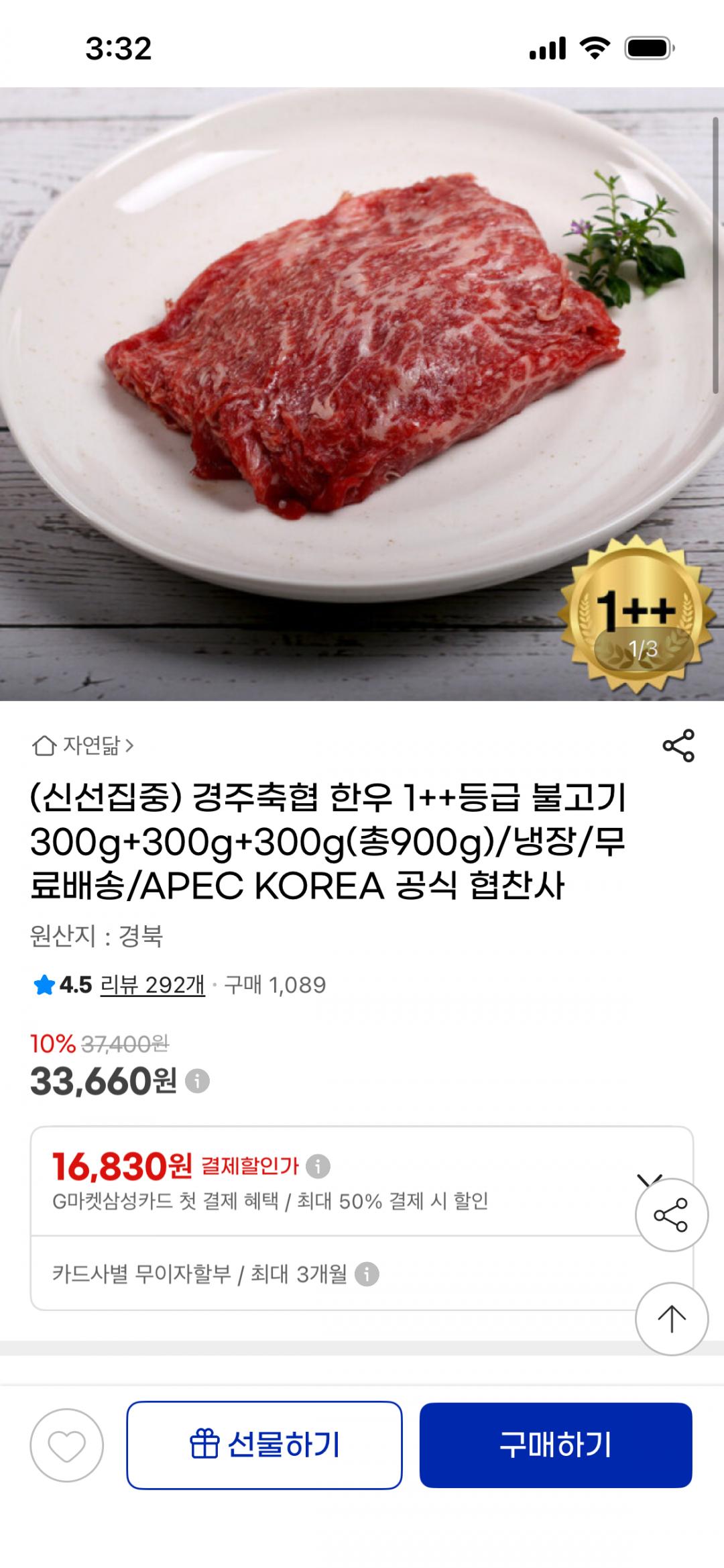 [지마켓] 경주축협 한우 1++등급 불고기300g+300g+300g(총900g) (33,660원/무료) > 국내핫딜