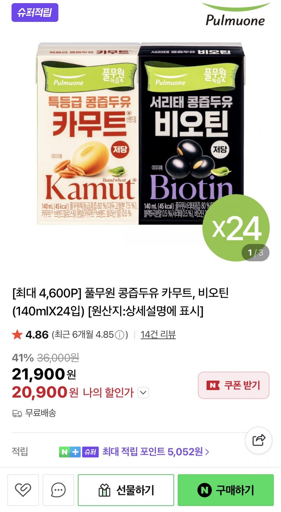풀무원 카무트 콩즙두유랑 비오틴 두유 할인하네요