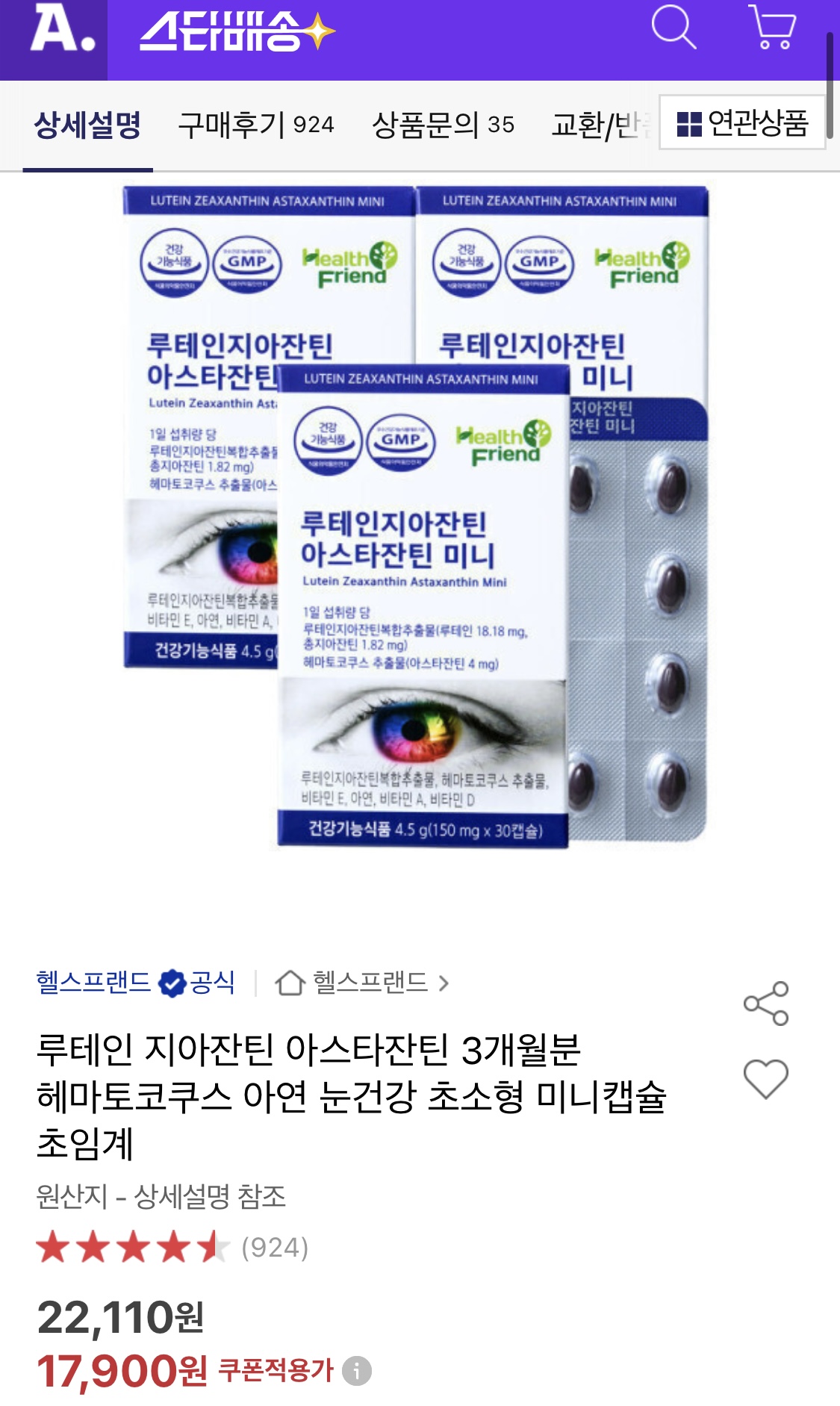 한캡슐 루테인 18.18mg + 지아잔틴 1.82mg + 아스타잔틴 4mg 든거라 1일 섭취량 충족 함량 좋습니다