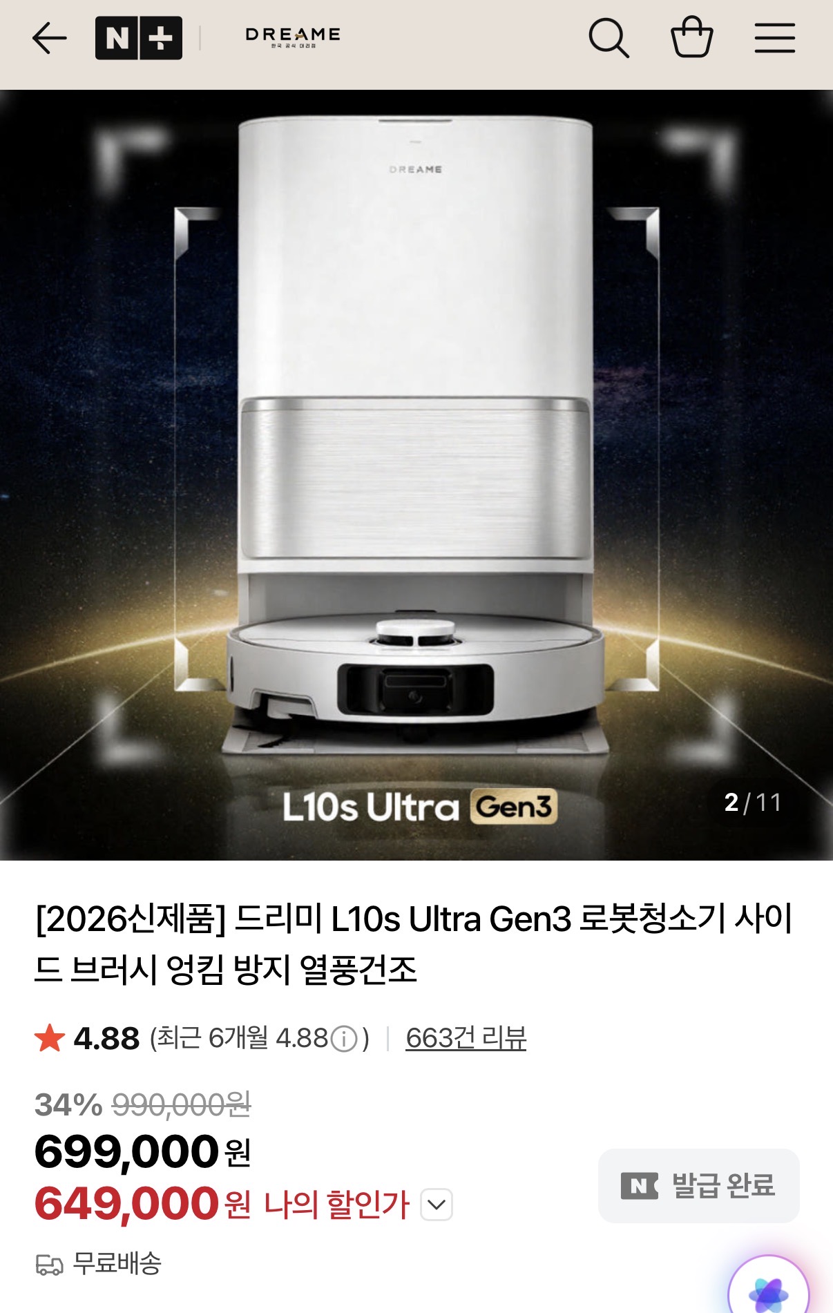[네이버] 드리미 L10s Ultra Gen3 로봇청소기 29% 할인 (649,000원/무료배송)