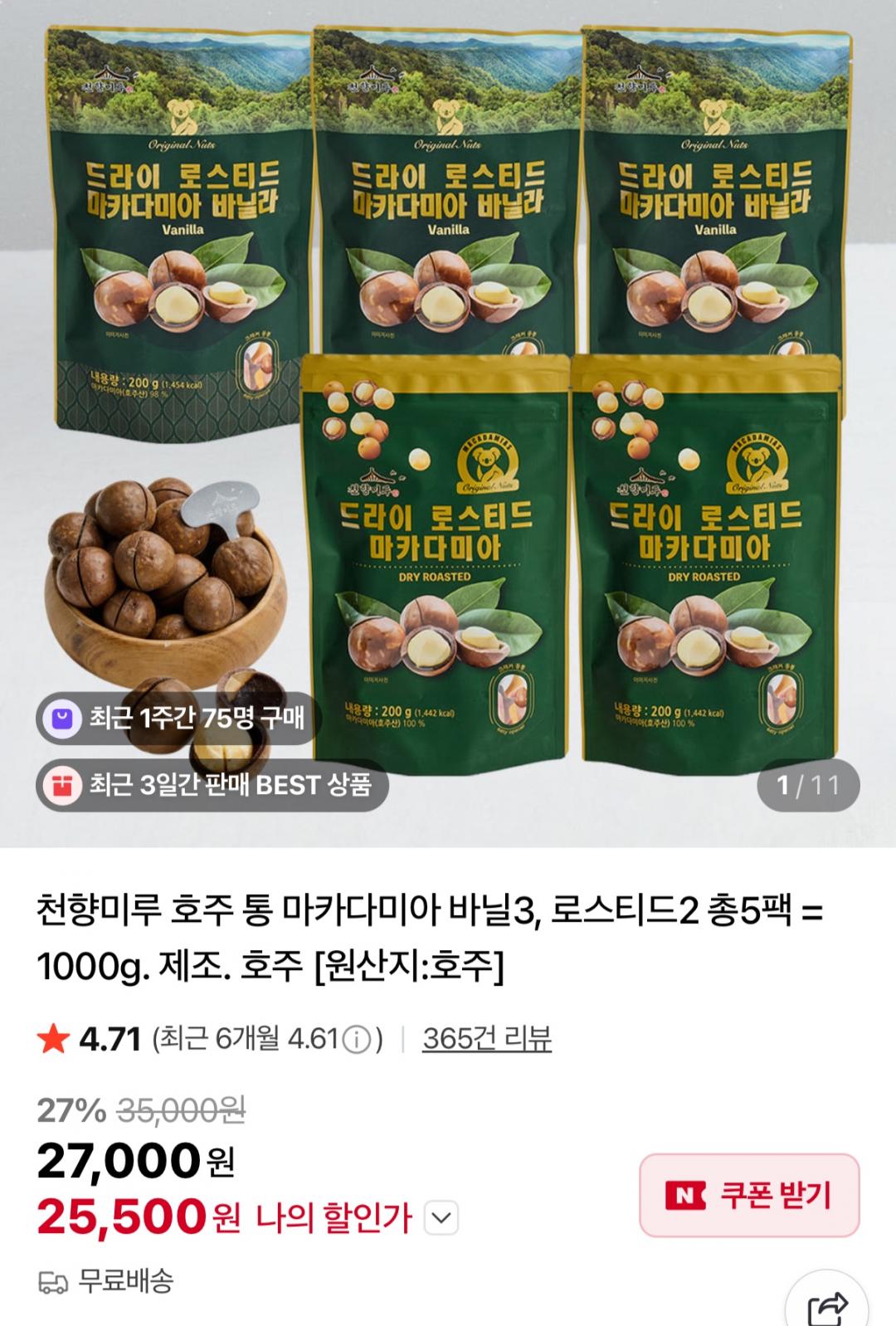 [네이버] 호주 통 마카다미아200g 5팩 (25,500원/무료)