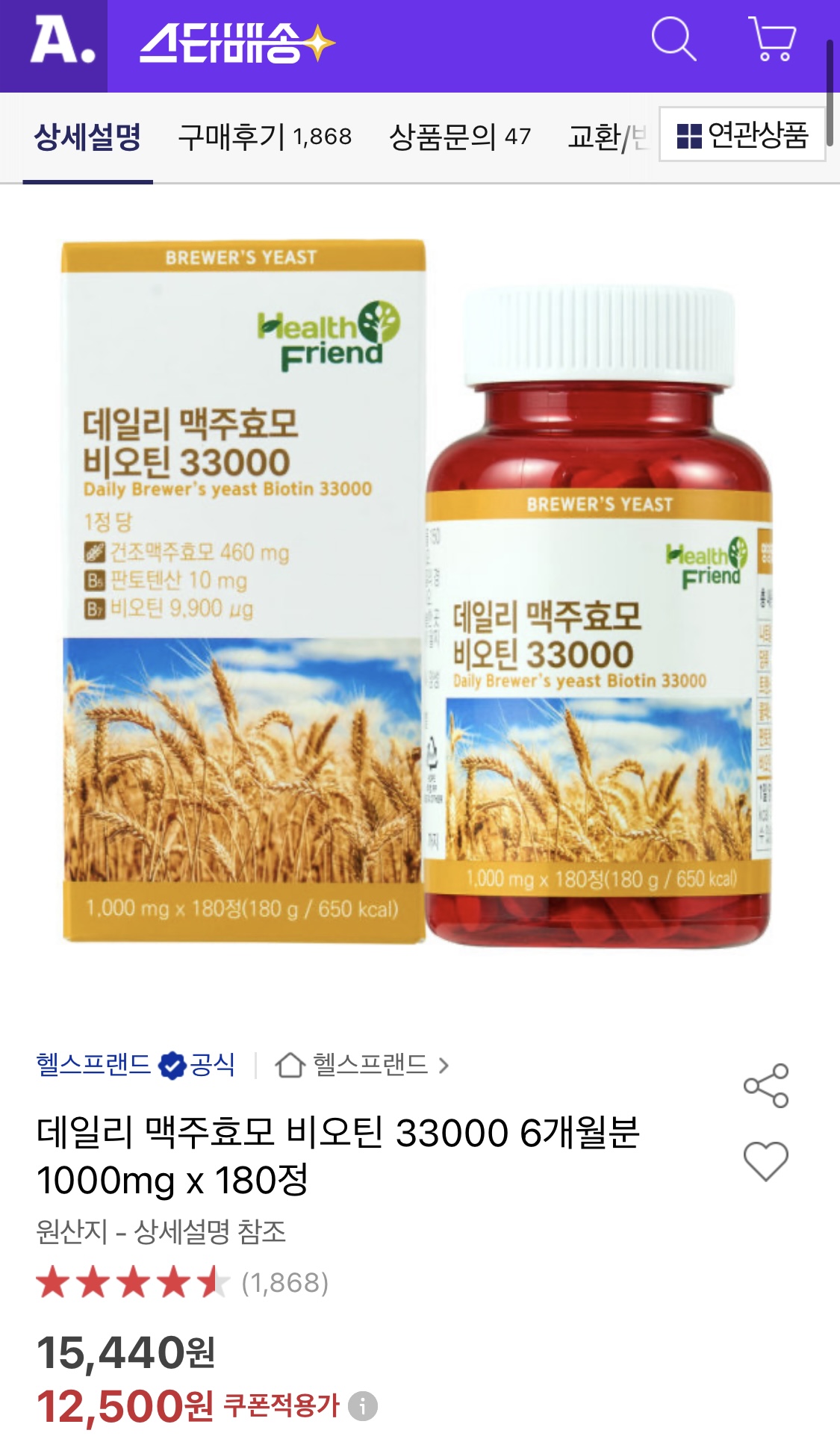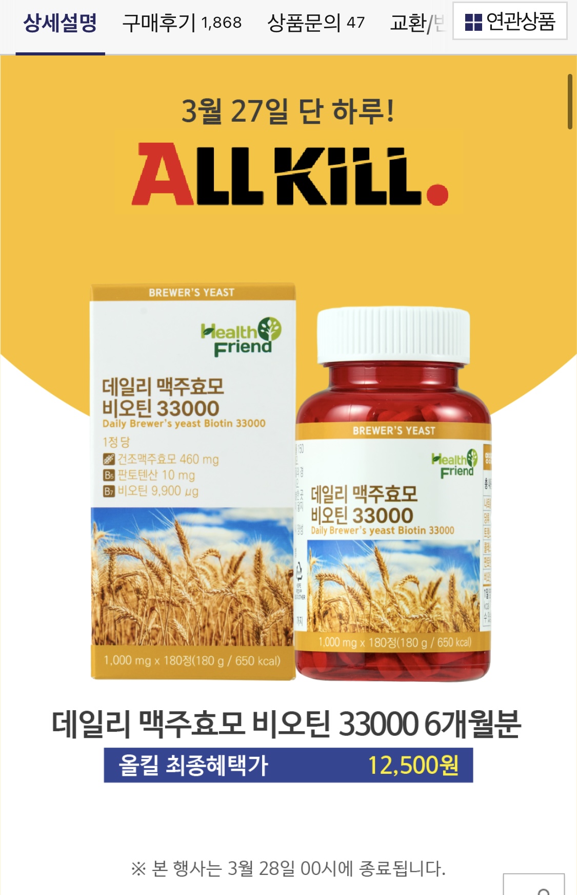 [옥션] 탈모 맥주효모 비오틴 33000 6개월분 180정 (12,500원/무료)