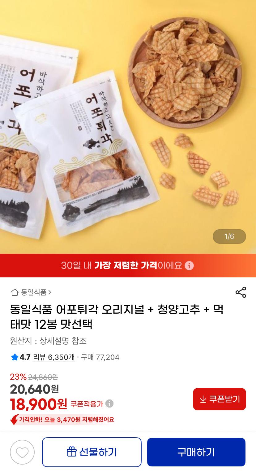 [지마켓]타임딜 어포튀각 오리지널+청양고추+먹태맛 12봉 (18,900원/무료) > 국내핫딜