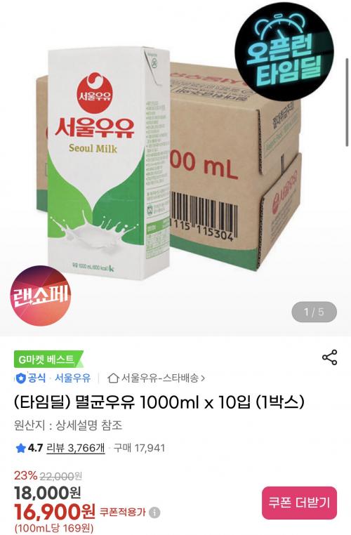 [지마켓] 서울우유 멸균우유 1000ml x 10입 (1박스) (16,900원/무료)