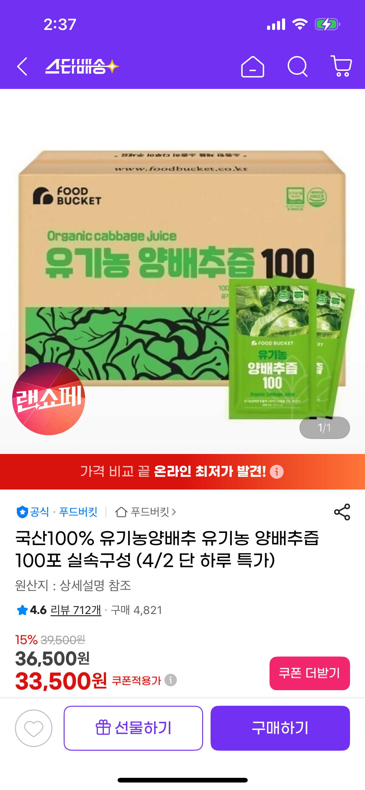 [지마켓] 유기농양배추 유기농 양배추즙 100포 (33,500원/무배) > 국내핫딜
