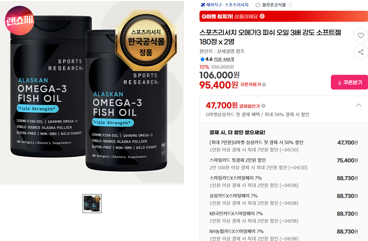 [지마켓] 스포츠리서치 오메가3 피쉬 오일 3배강도 180정 x 2병(88,730원/무료) > 국내핫딜