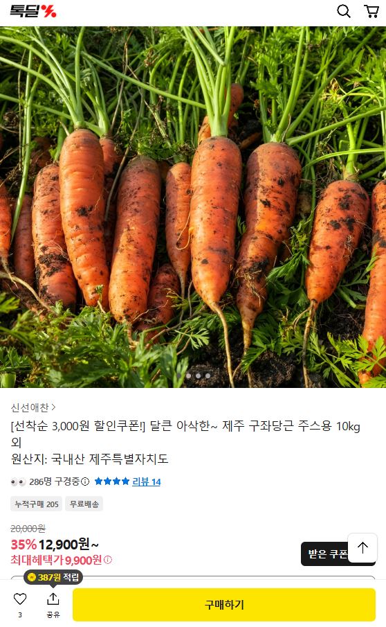 [카카오] 제주 구좌당근 주스용 10kg (9,900/무료) > 국내핫딜