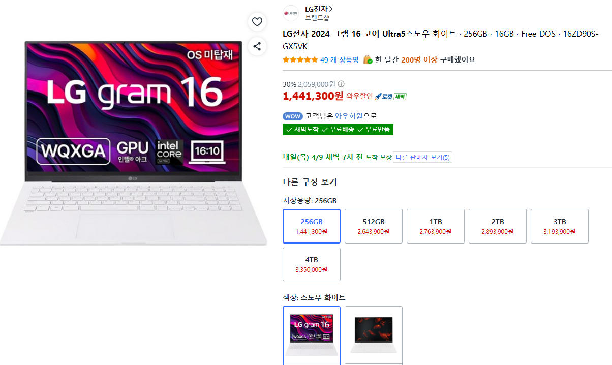 [쿠팡] LG 그램 16ZD90S-GX5VK (1,441,300원/무료)