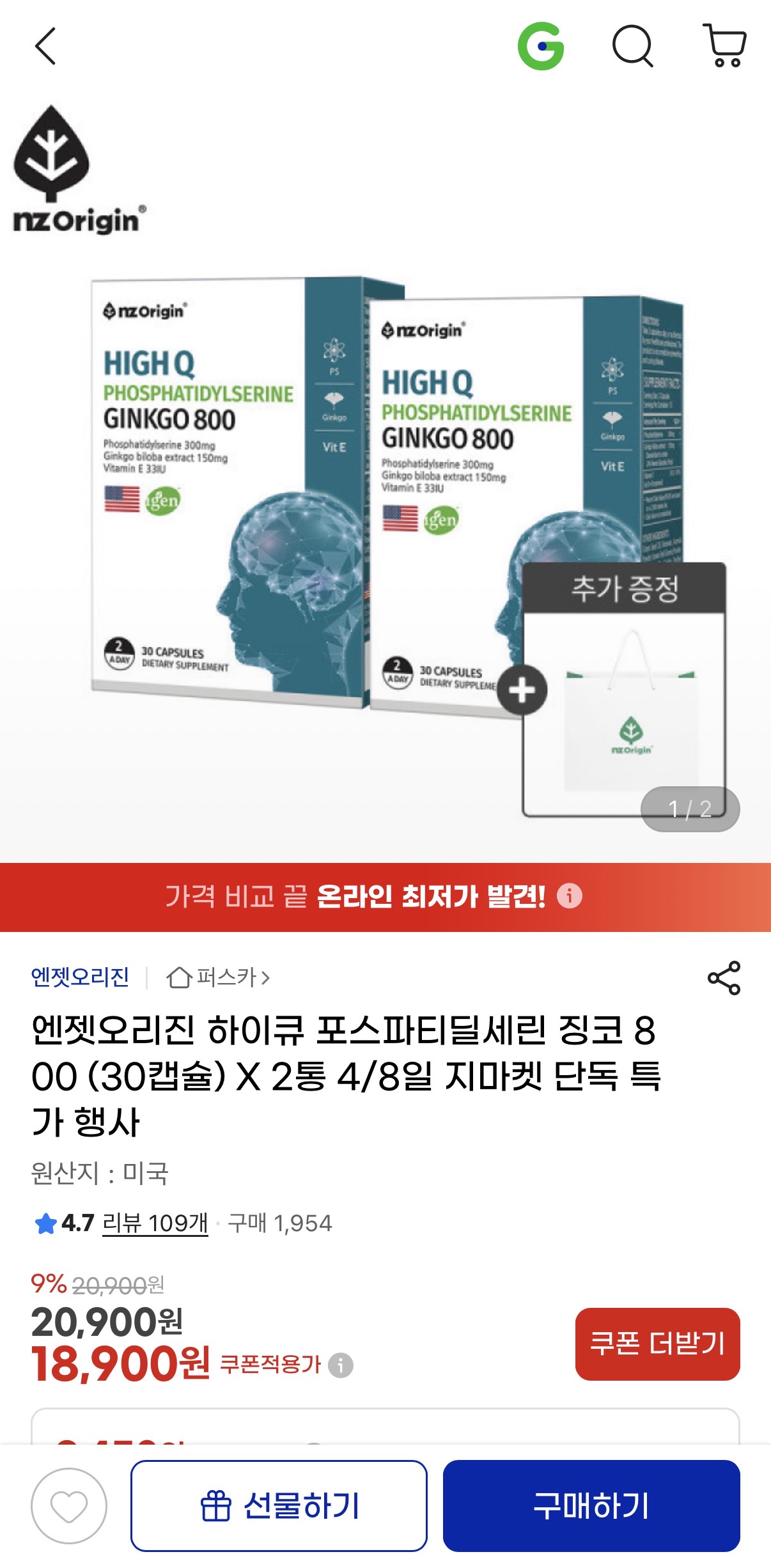 [지마켓] 엔젯오리진 하이큐 포스파티딜세린 징코 800 (30캡슐) 2통 (18,900원/무배)