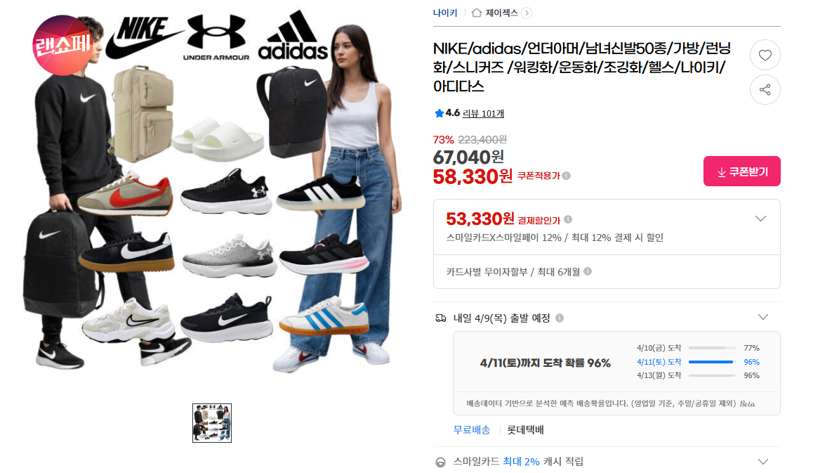 나이키/언더아머/아디다스 신발 및 가방 50종 12%+5% 쿠폰 적용 가능한 구성으로