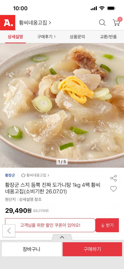 [옥션] 황장군 스지 도가니탕 1kg 4팩 (29,490원/무료) > 국내핫딜