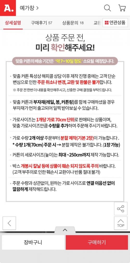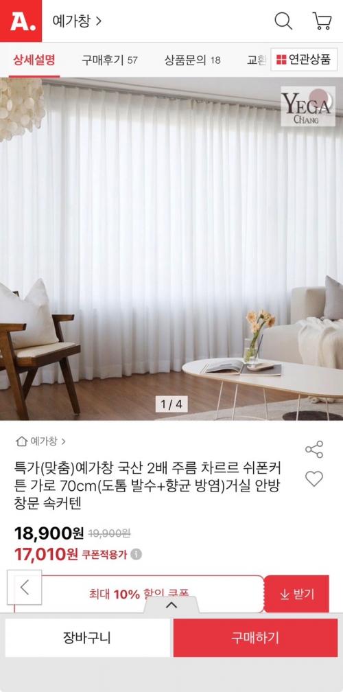 [옥션] (맞춤) 예가창 국산 2배 나비주름 베이직 쉬폰커튼 가로 70cm (17,010원~/4,000원) > 국내핫딜