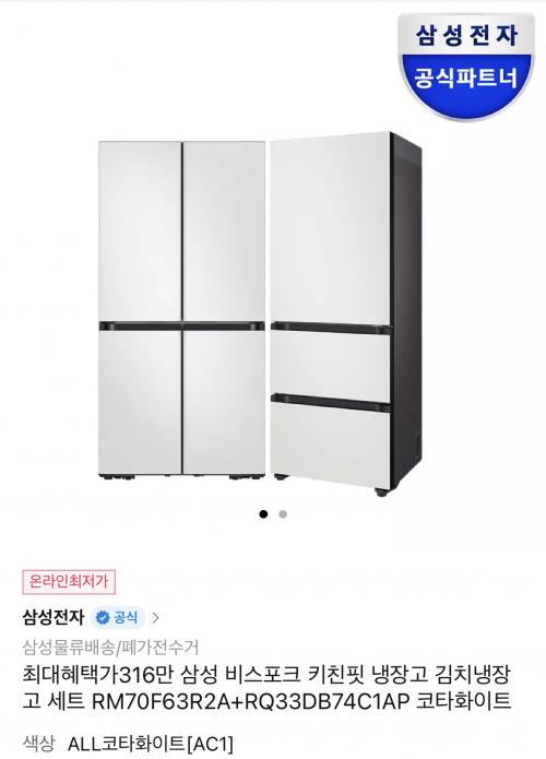 [11번가]삼성 비스포크 키친핏 냉장고 김치냉장고 세트 RM70F63R2A+RQ33DB74C1AP 코타화이트 (3,199,000원 /무료) > 국내핫딜