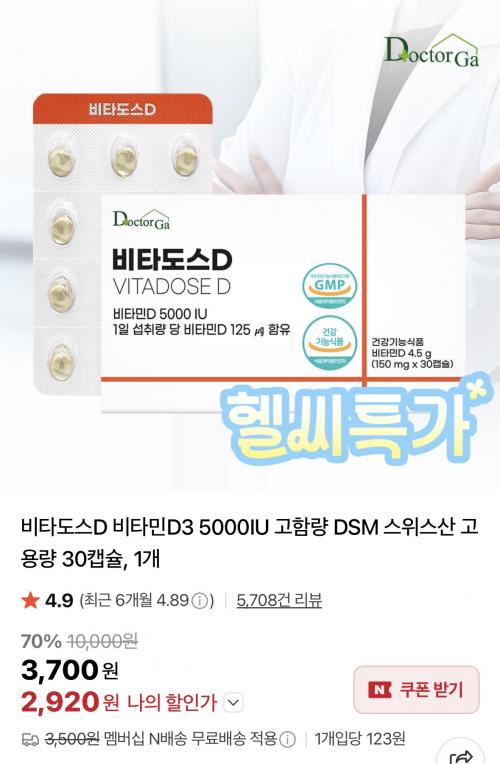 [네이버]비타도스D 비타민D3 5000iu 30캡슐 (2,920원/네멤무료) > 국내핫딜