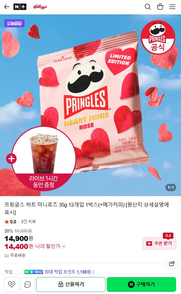 [네이버] 프링글스 하트 미니로즈 35g 12개입 1박스 (14,400원/무료)