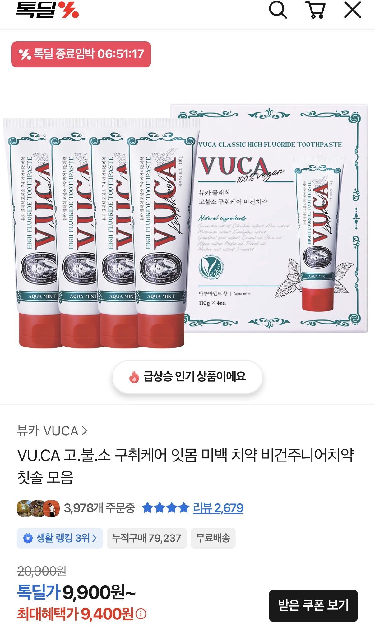 [카카오] 뷰카 고불소 구취케어치약 4개입 (9,400원/무배) > 국내핫딜