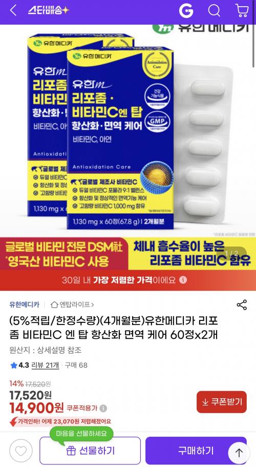 리포좀 비타민C 4개월분 구성에 14,900원이면 가격 괜찮게 나온 편이네요
