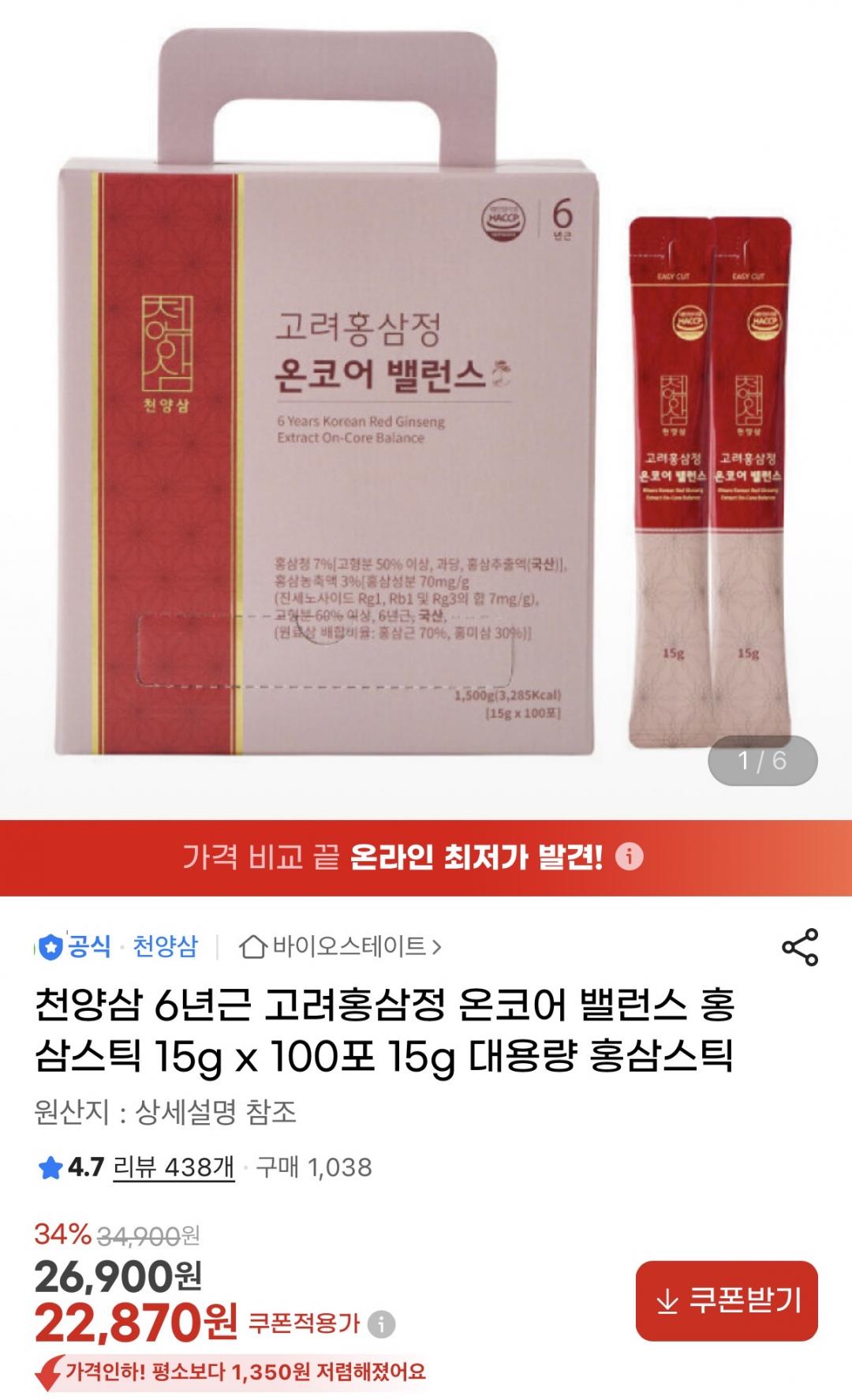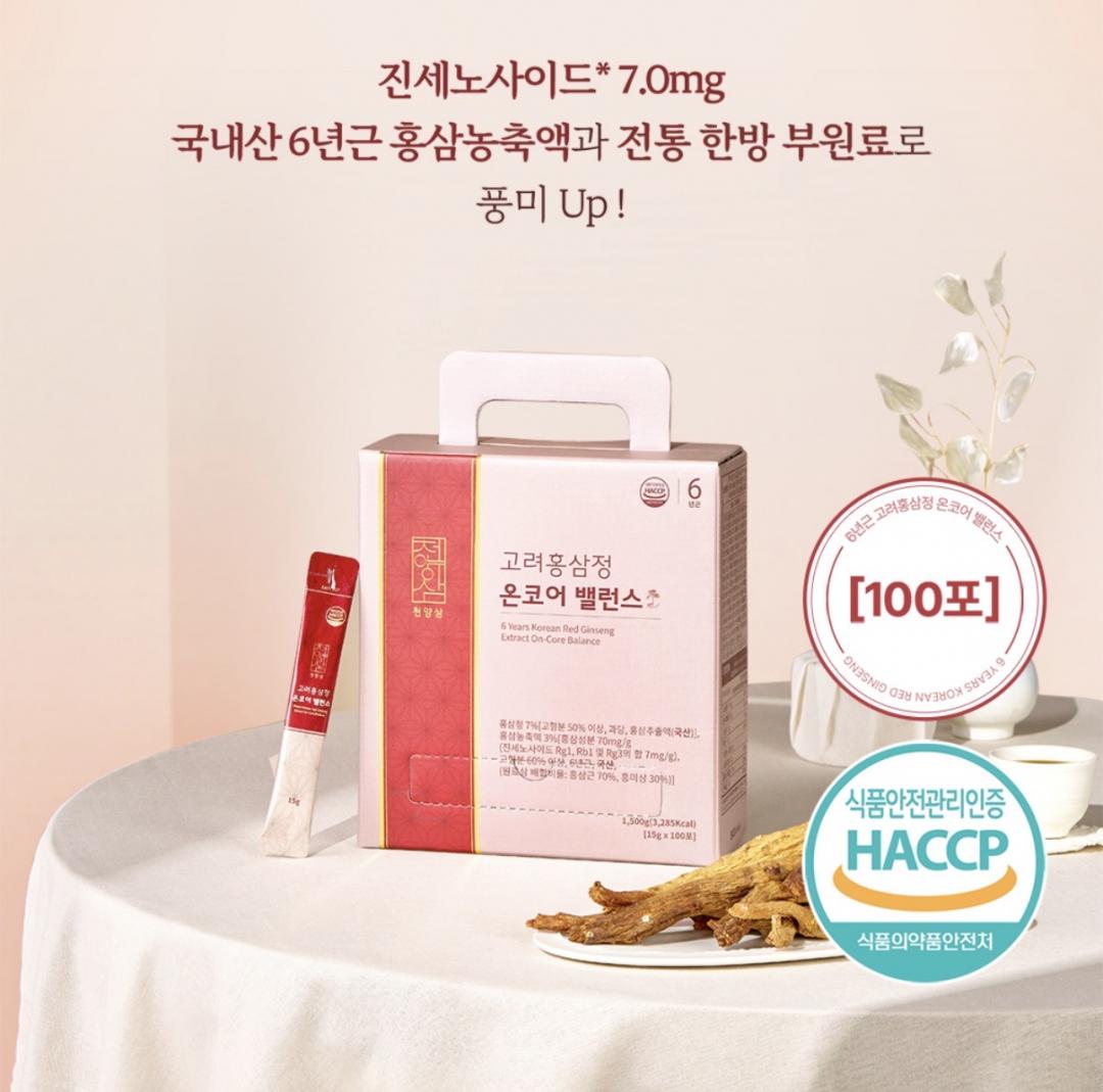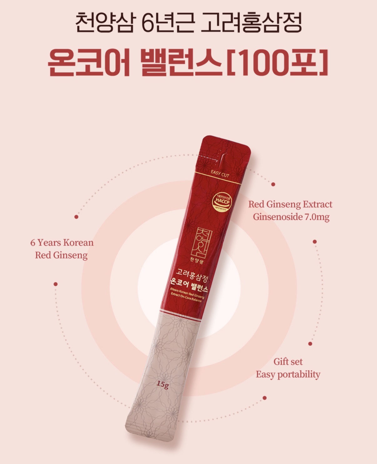 [지마켓]천양삼 6년근 고려홍삼정 온코어 밸런스 홍삼스틱 15g x 100포(22,870원/무배) > 국내핫딜