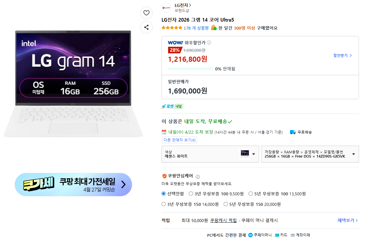 [쿠팡] LG 그램 14ZD90S-GX5VK (1,216,800원/무료)