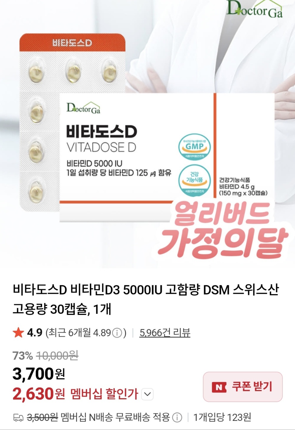 [네이버] 비타도스D 비타민D3 5000IU 고함량 30캡슐 1개 (2,630원/네멤무료)