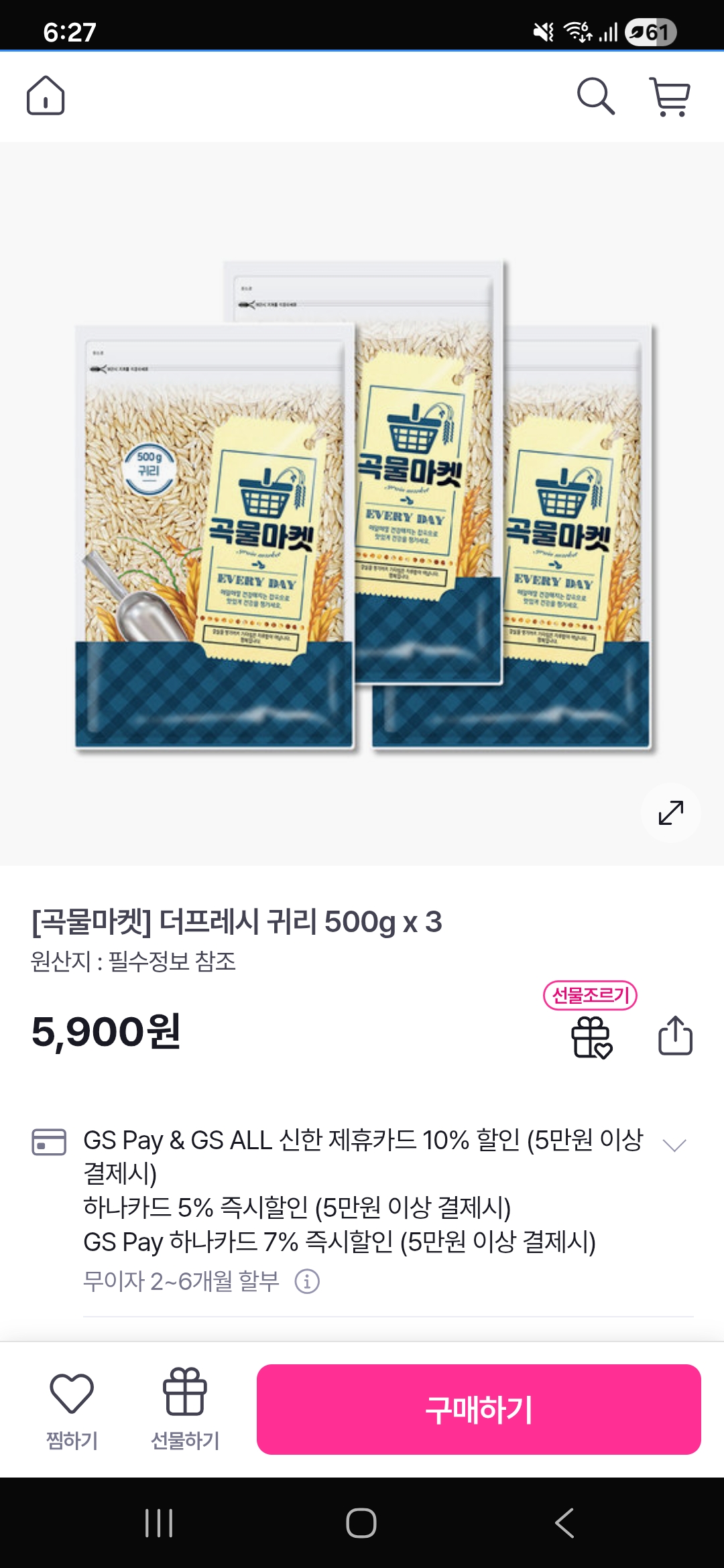 [GS샵] 곡물마켓 더프레시 귀리 500g x3 (5,900원/ 무배) > 국내핫딜