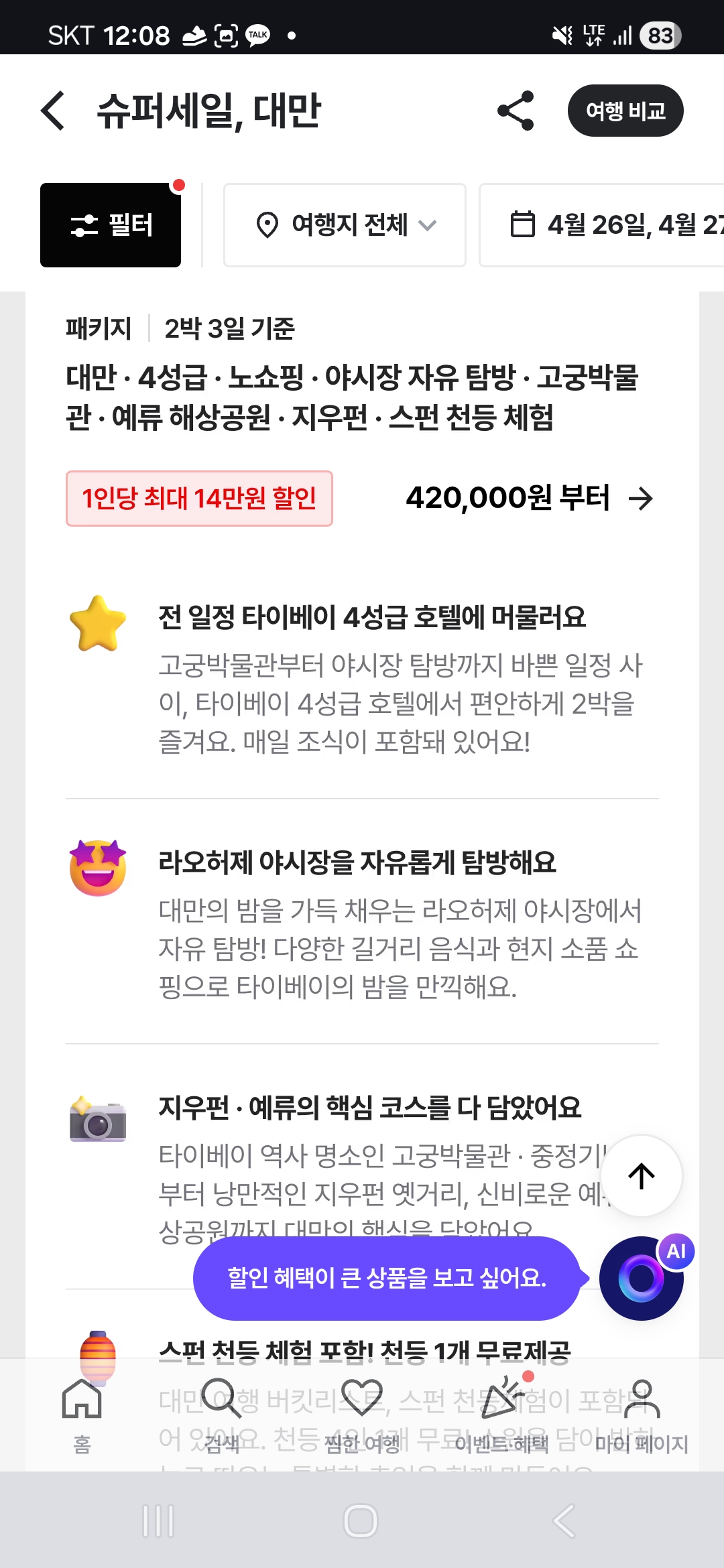 [트립스토어] 대만 2박3일 노쇼핑 패키지 (42만부터/무료) > 국내핫딜