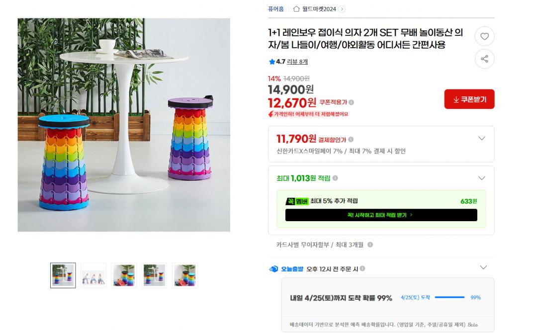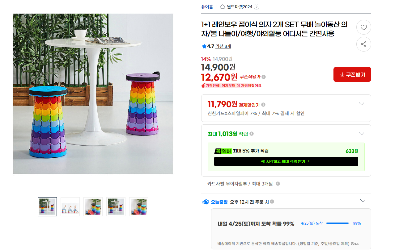 [지마켓] 1+1 레인보우 접이식 의자 2개 SET 12,670원/무배 > 국내핫딜
