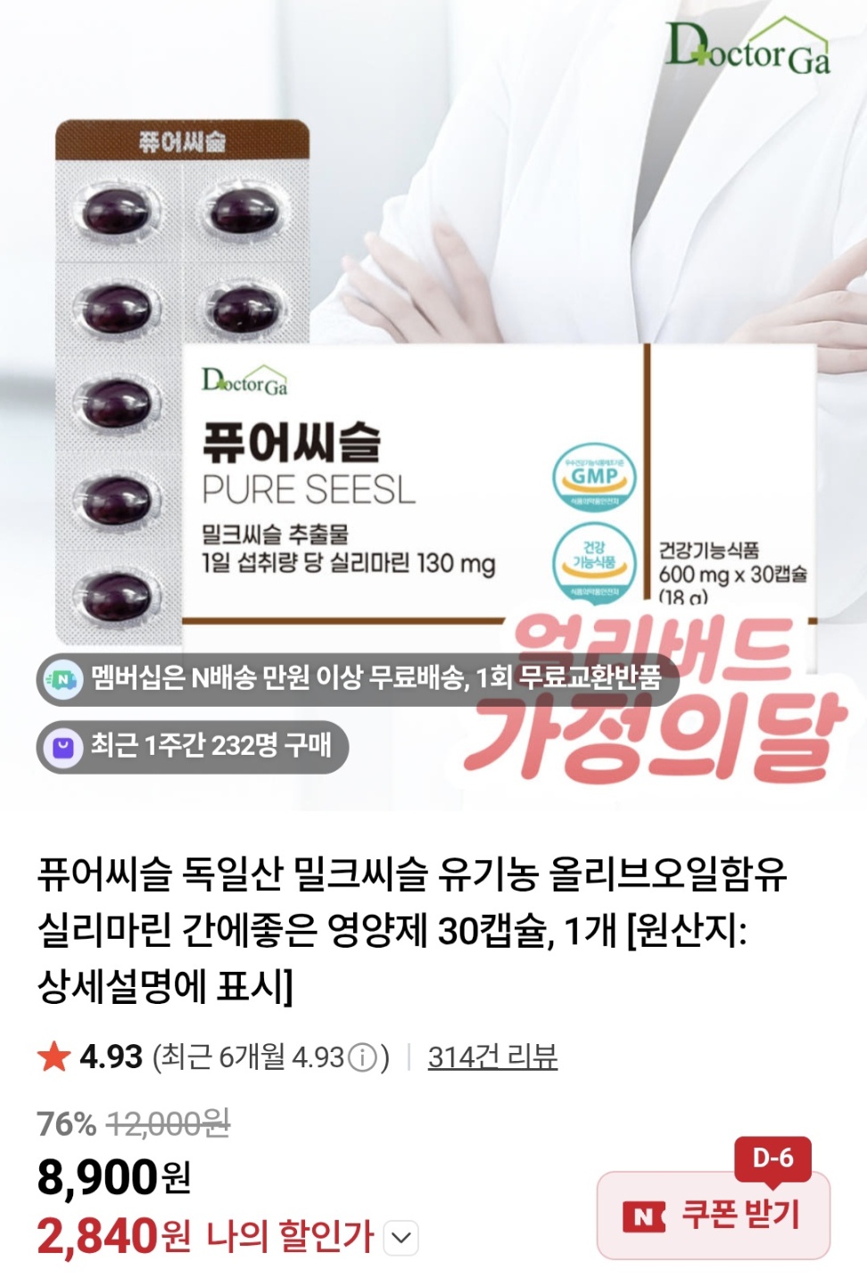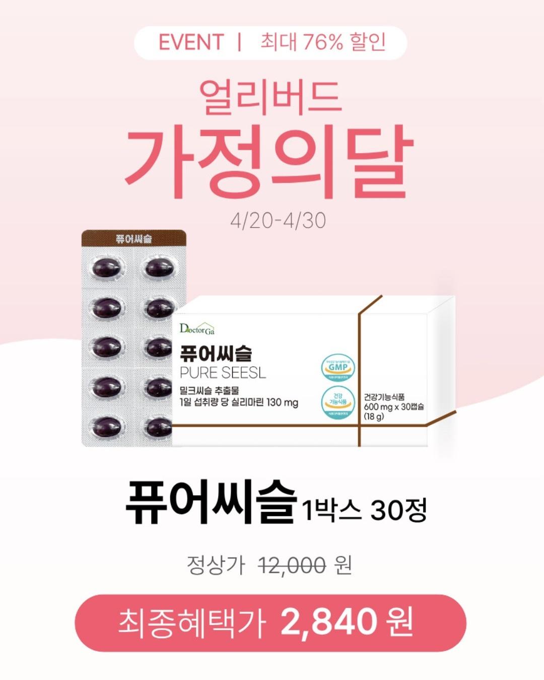 [네이버] 퓨어씨슬 독일산 밀크씨슬 유기농 올리브오일함유 실리마린 간에좋은 영양제 30캡슐 1개 (2,840원/네멤무료) > 국내핫딜