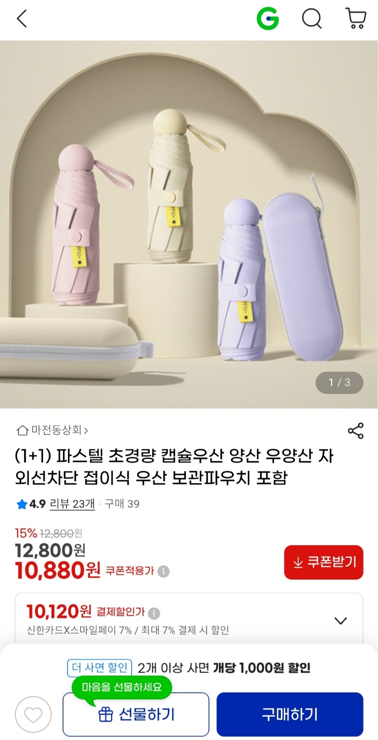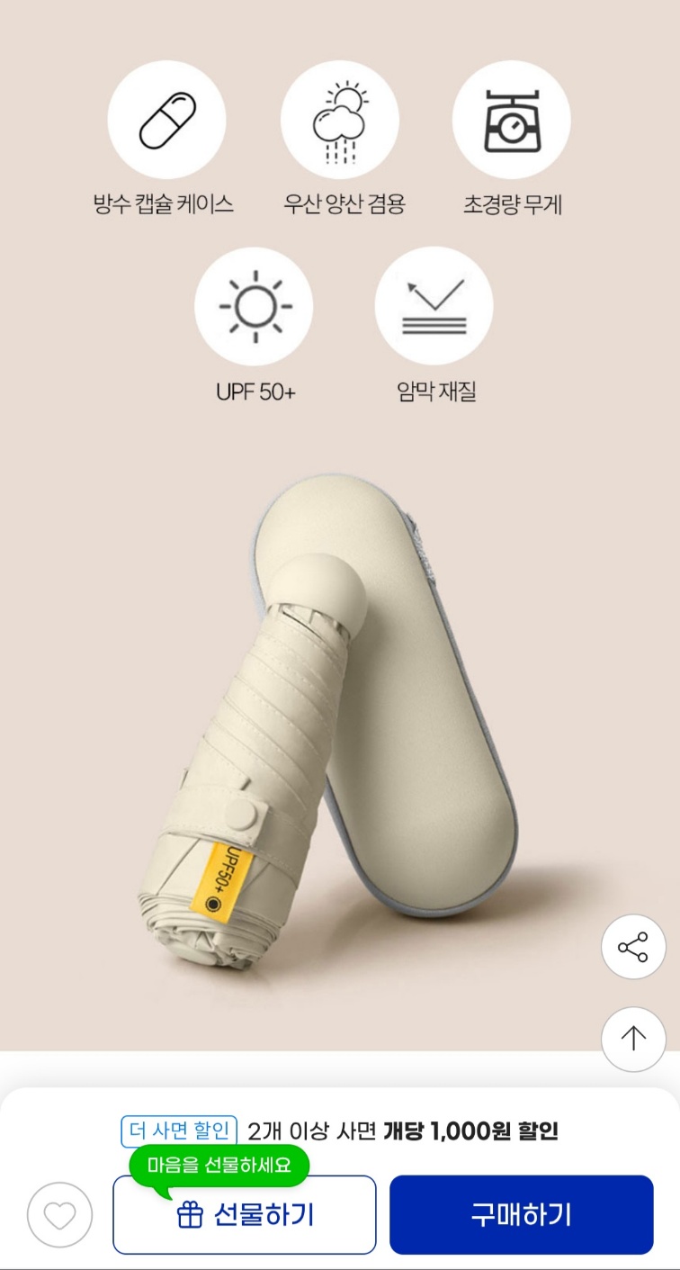 [지마켓] 파스텔 초경량 캡슐우산 1+1 (10,880원 / 무료배송) > 국내핫딜