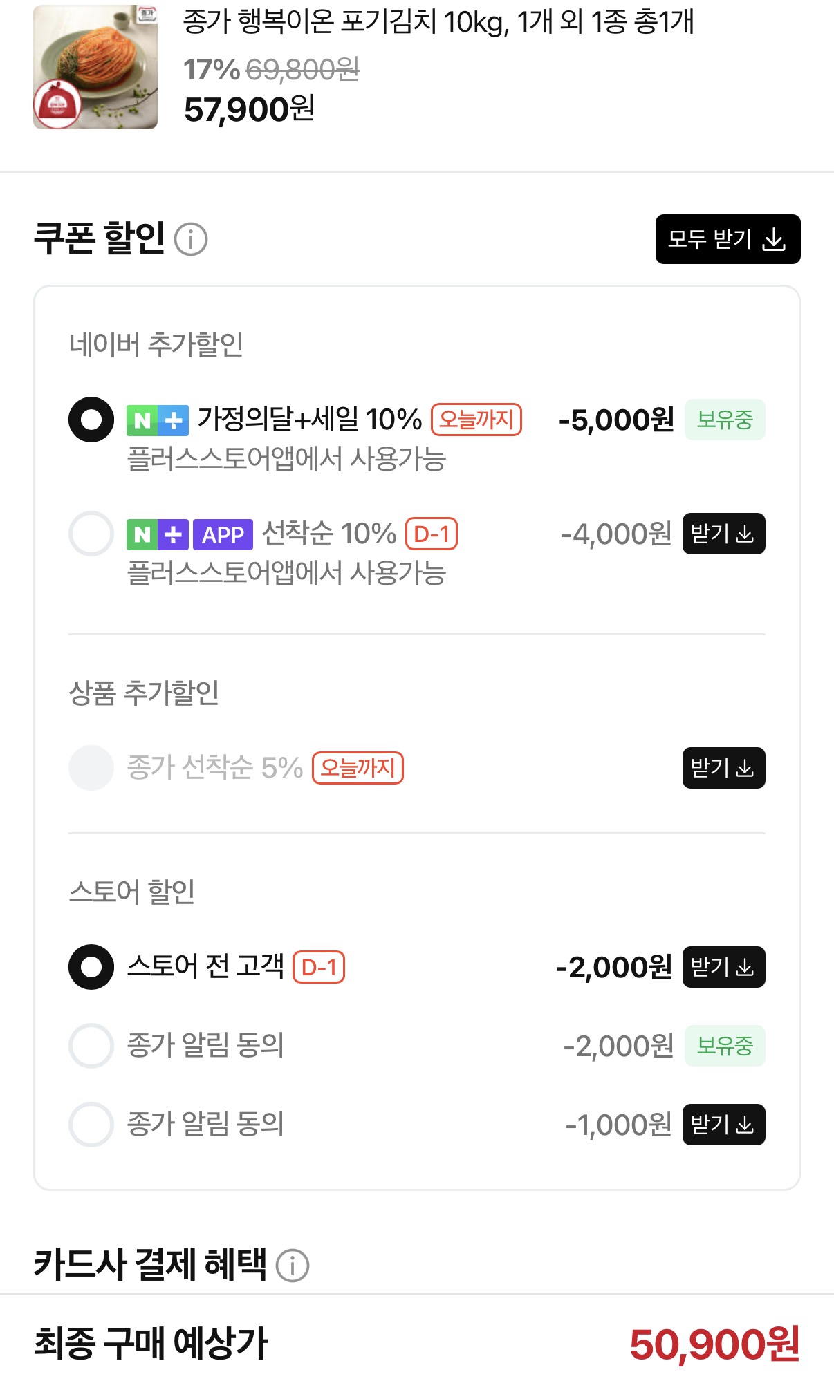 [네이버] 종가 행복이온 포기김치 10kg (50,900원/무료)