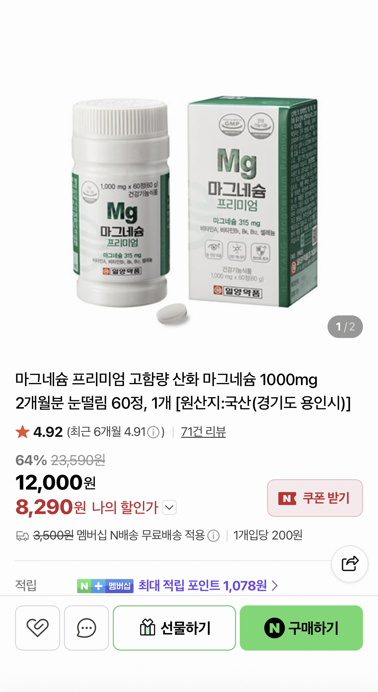 [네이버] 마그네슘 프리미엄 고햠량 60정 1개 (8,290원/네멤무배)