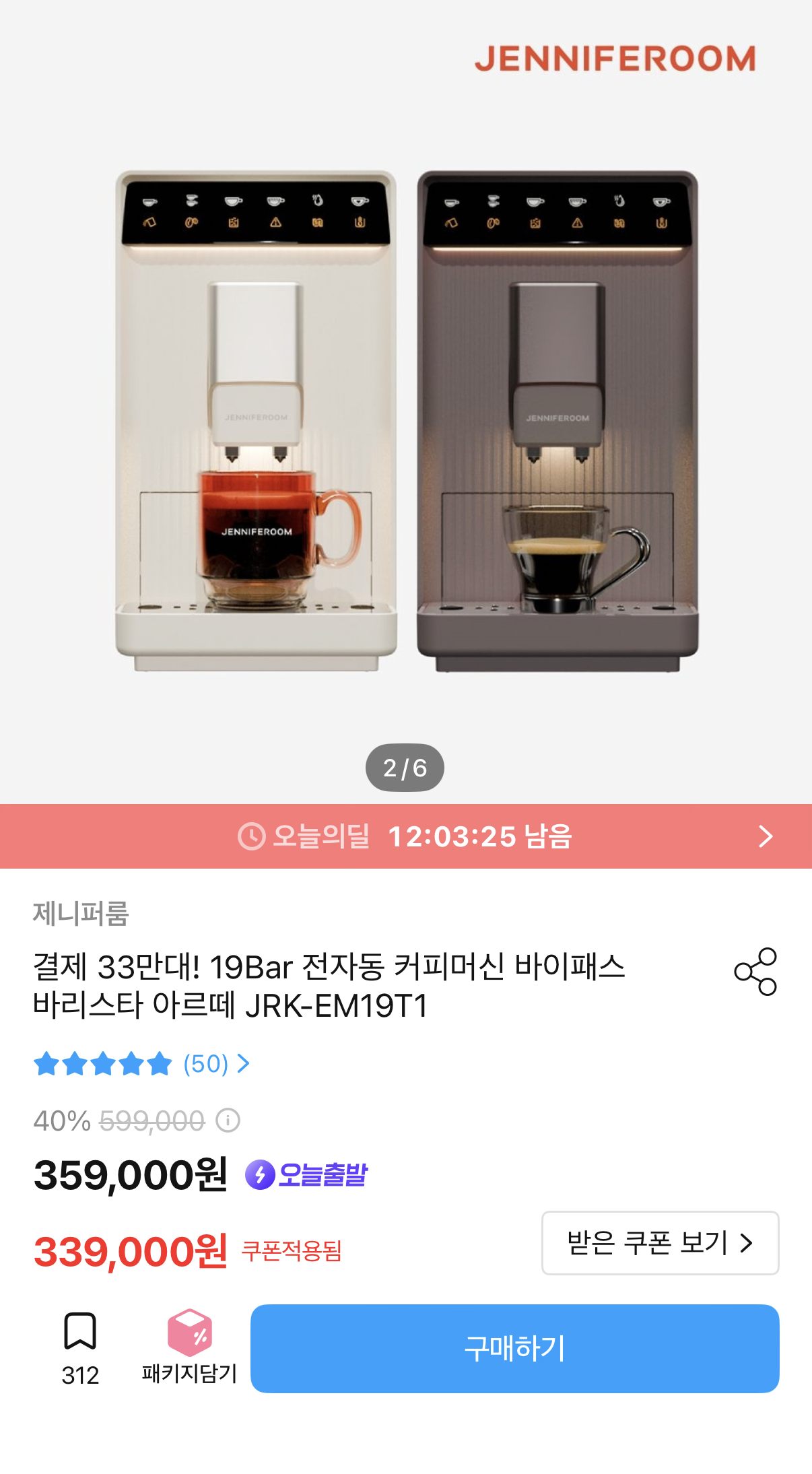 [오늘의집] 제니퍼룸 19Bar 전자동 커피머신 JRK-EM19T1 오트밀/브라운 (339,000원/무료)