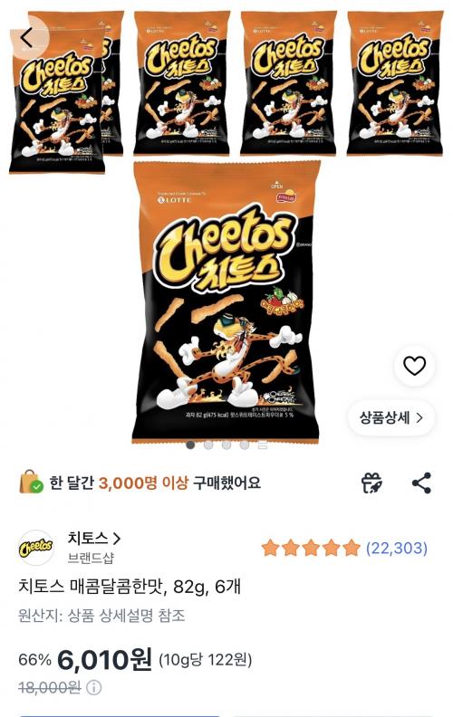 [쿠팡] 치토스 매콤달콤한맛 82g 6개 (6,010원/와우무료)