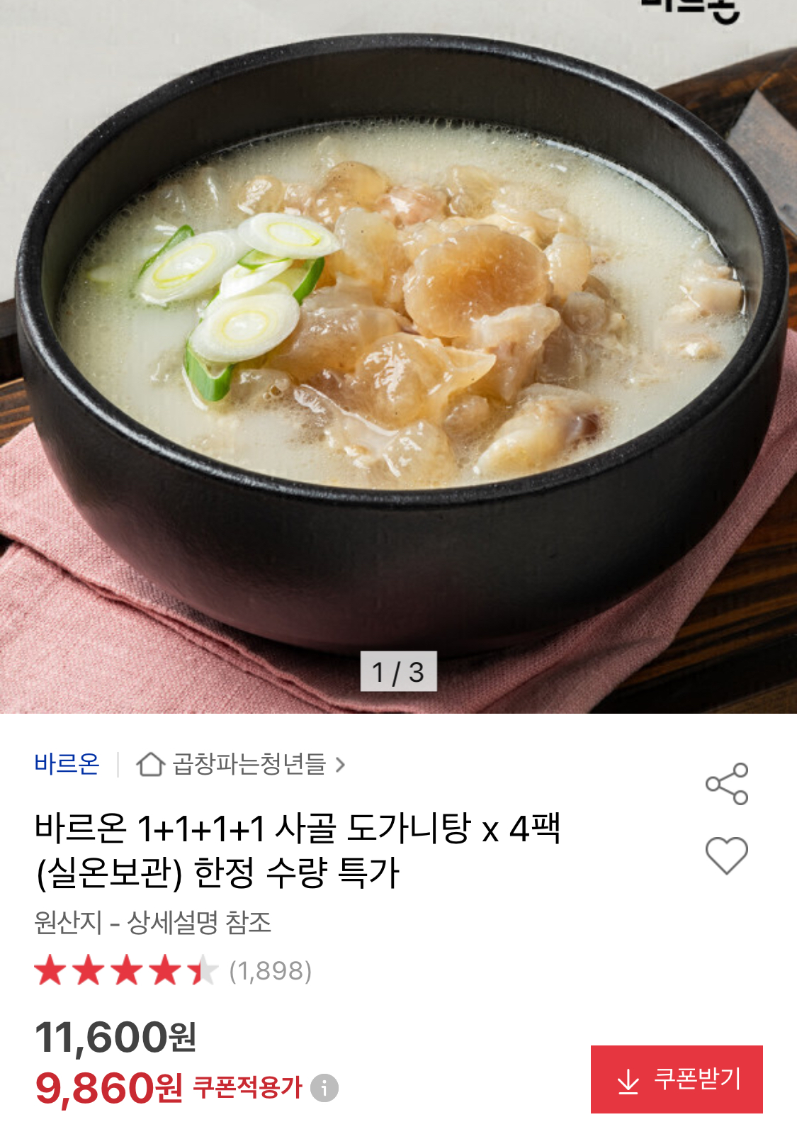 [옥션] 바르온 도가니탕 600g 4팩 (9,860원/무료)