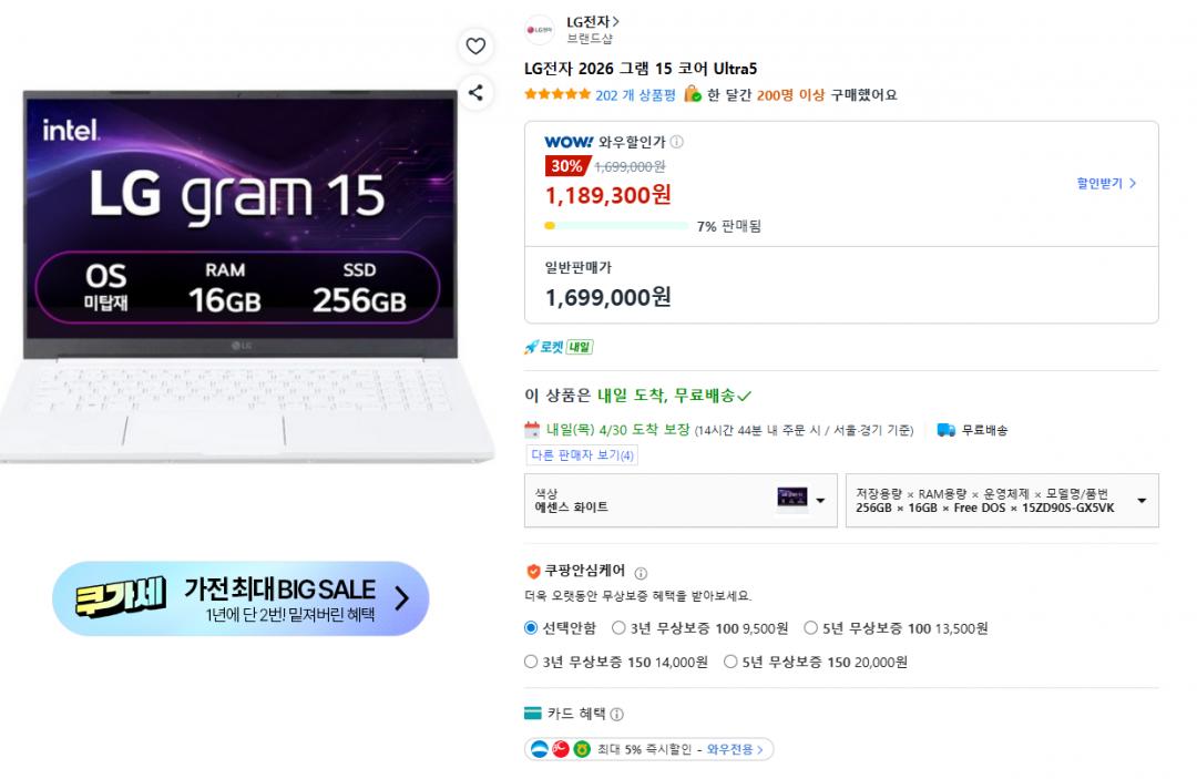 [쿠팡] LG 그램 15ZD90S-GX5VK (1,189,300원/무료)