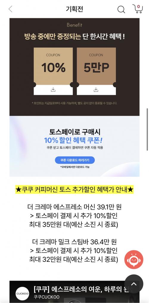 우유 스팀 가능한 쿠쿠 커피머신 라이브 할인해요.