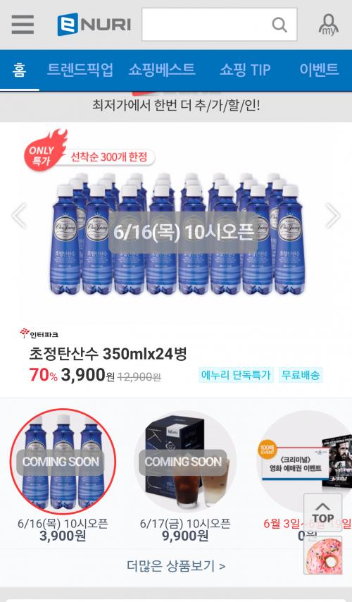 [인터파크] 초정탄산수 350ml×24(3900/0) > 국내핫딜