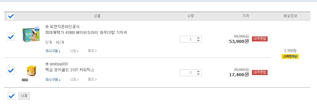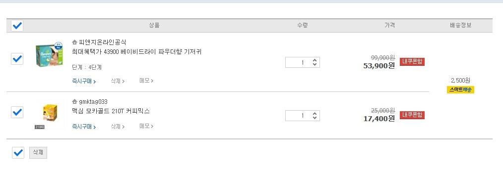 장바구니에 담고 내쿠폰함에서 스마트배송 배송비 무료쿠폰 다운 받아서 모카골드에 쿠폰 적용시켰더니