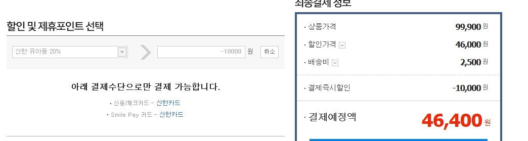 팸퍼스 쿠폰 6천원할인 + 카드할인 1만원 하면 최종 43,900원인데 유료배송이라 46,400원 나오네요 ㅎ