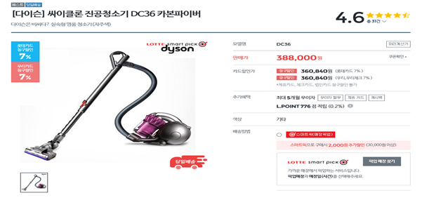 다이슨 할인도 잘 안하고 가격이 높은 편인데 근래에 꽤 좋은 가격으로 나왔네요