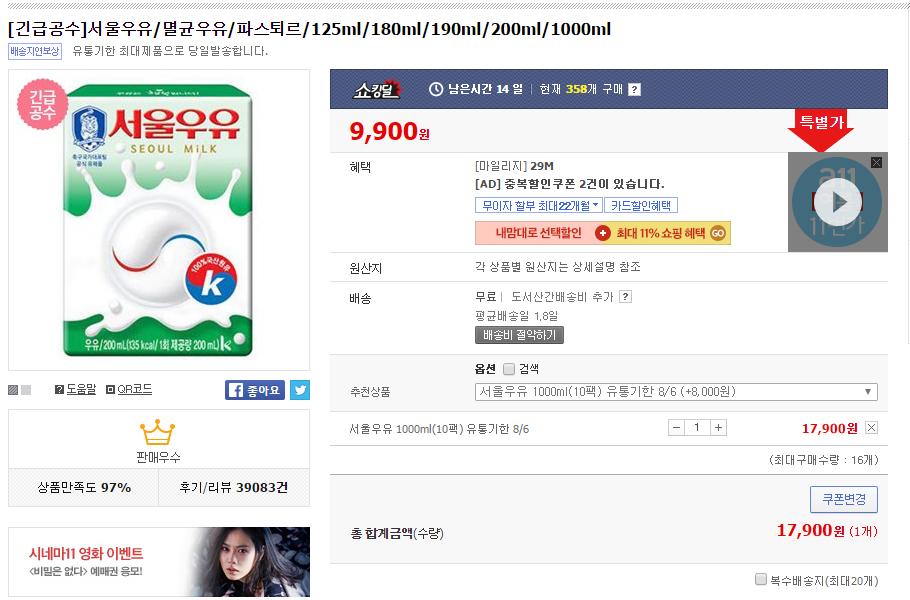 저희집은 많이먹어서 1000ml 짜리로만 시키다보니...매일보다 서울이 나은거같아서요 ㅠㅠ |