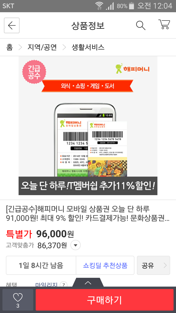 해피머니가 컬쳐랜드보다는 품절되는 속도가 느리긴한데 최근 해피머니가 풀린게 적은듯해서 어떻게 될지 모르겠네요.... |