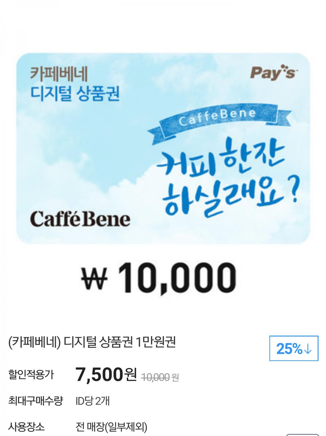 [G마켓] 카페베네 1만원 상품권 (7500/0)