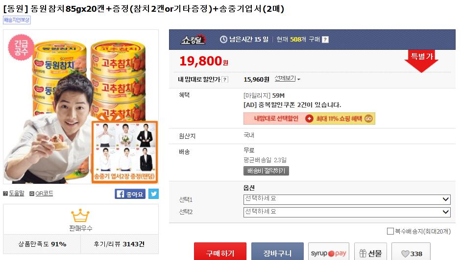 동원참치 85g*22캔 (16,800원/무료), 마일리지나 T멤버십 적용 시 15,960원에 구매가능합니다.