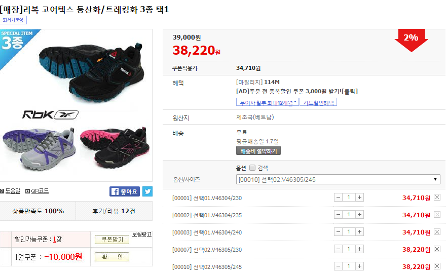[11번가] 리복 고어텍스 등산화/트레킹화 3종 택1 (38,220원/무료) > 국내핫딜